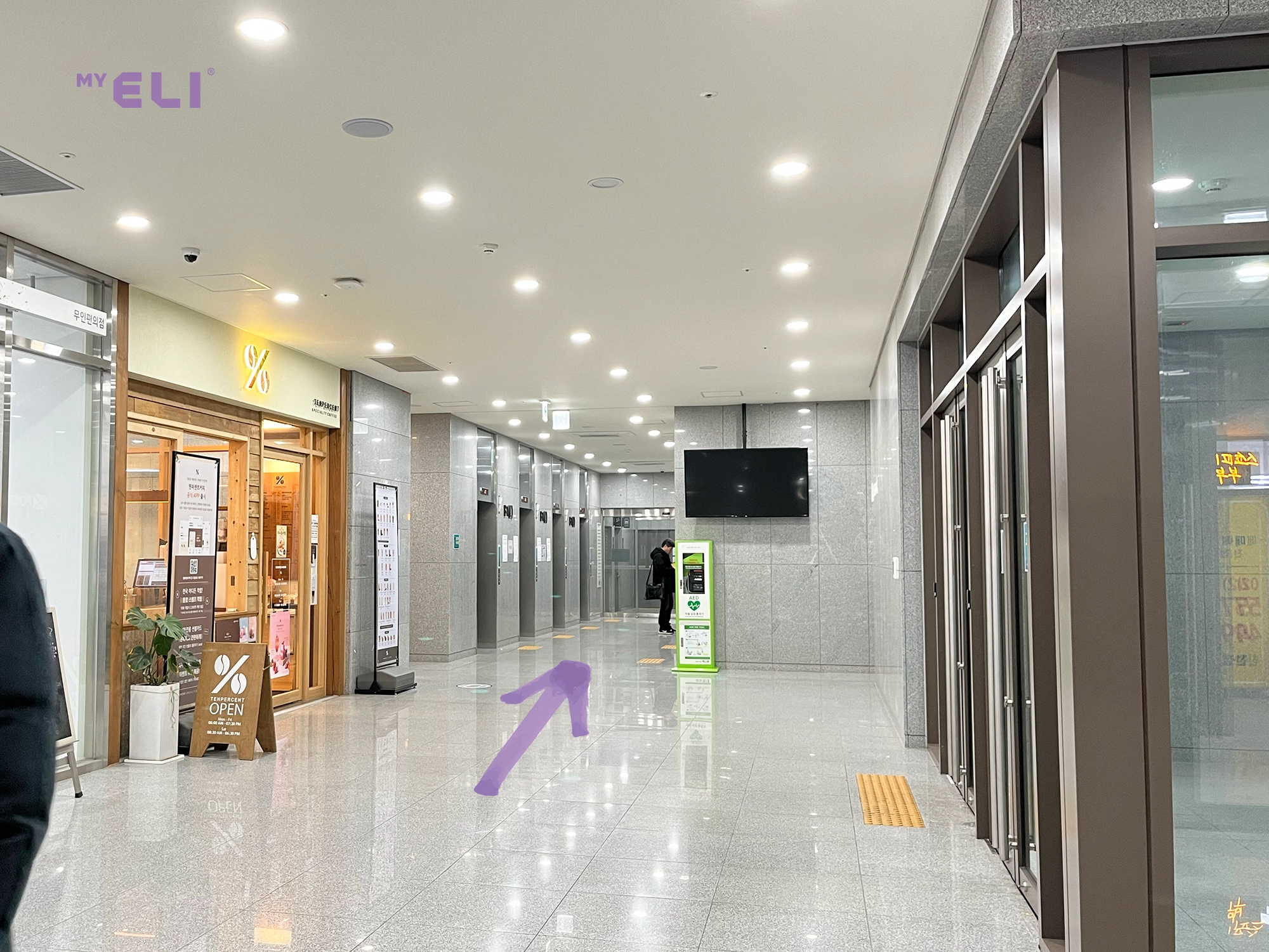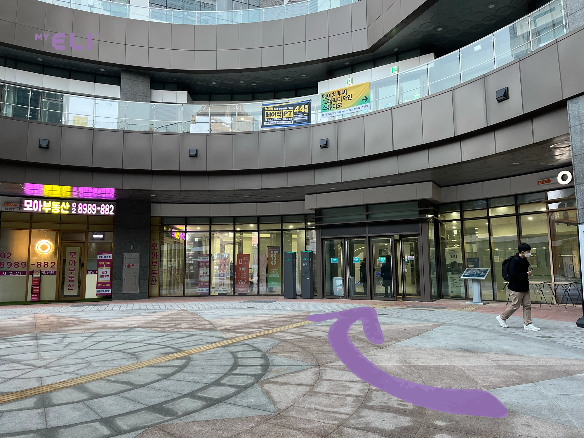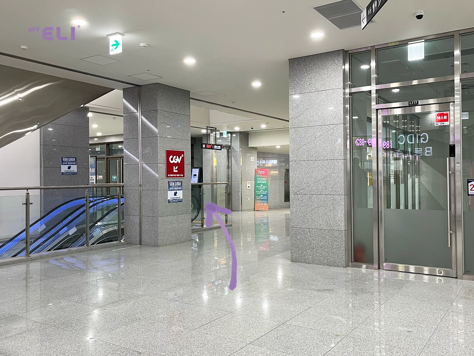 중앙 문으로 들어오신 뒤 에스컬레이터 쪽으로 들어오신 뒤 B5층으로 내려와 주시면 됩니다.